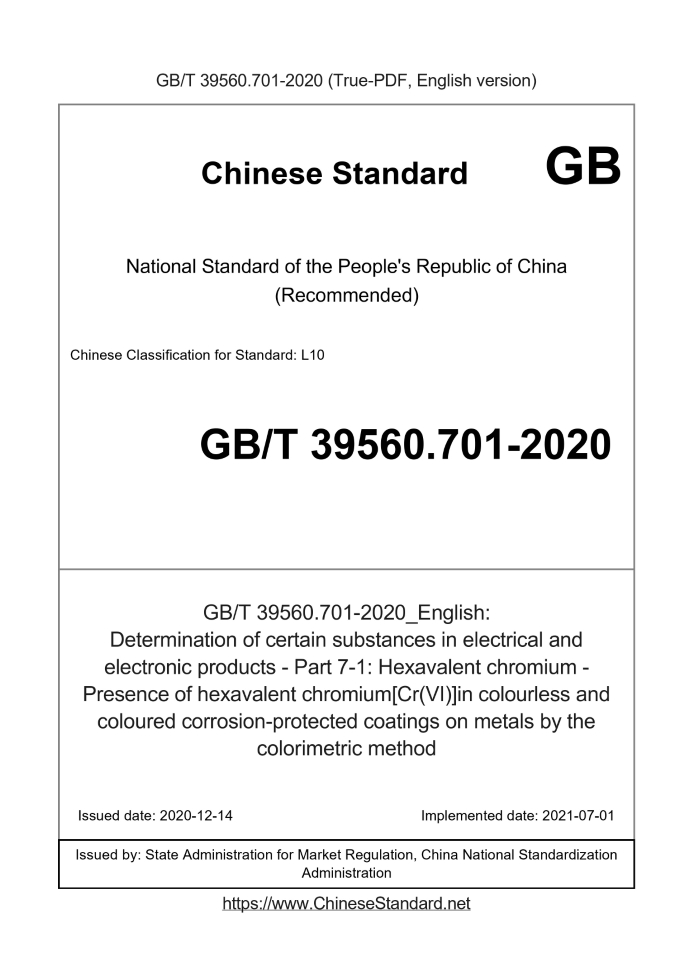 Delivery: <= 3 days. True-PDF full-copy in English will be manually translated and delivered via email. GB/T 39560.701-2020: Determination of certain substances in electrical and electronic products - Part 7-1: Hexavalent chromium - Presence of hexavalent chromium[Cr(VI)]in colourless and coloured corrosion-protected coatings on metals by the colorimetric method Status: Valid