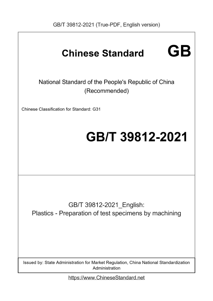 Delivery: <= 3 days. True-PDF full-copy in English will be manually translated and delivered via email. GB/T 39812-2021: Plastics - Preparation of test specimens by machining Status: Valid
