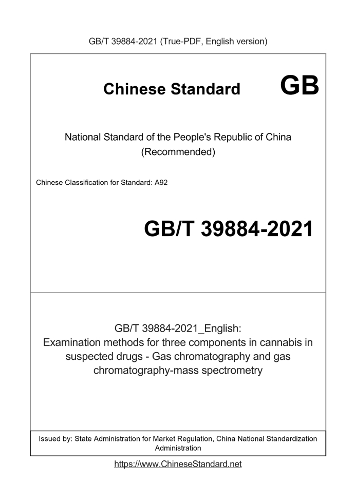 Delivery: <= 3 days. True-PDF full-copy in English will be manually translated and delivered via email. GB/T 39884-2021: Examination methods for three components in cannabis in suspected drugs - Gas chromatography and gas chromatography-mass spectrometry Status: Valid