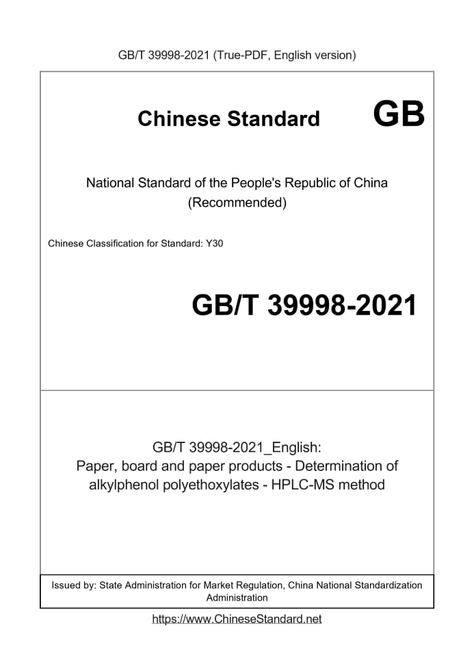 Delivery: <= 3 days. True-PDF full-copy in English will be manually translated and delivered via email. GB/T 39998-2021: Paper, board and paper products - Determination of alkylphenol polyethoxylates - HPLC-MS method Status: Valid