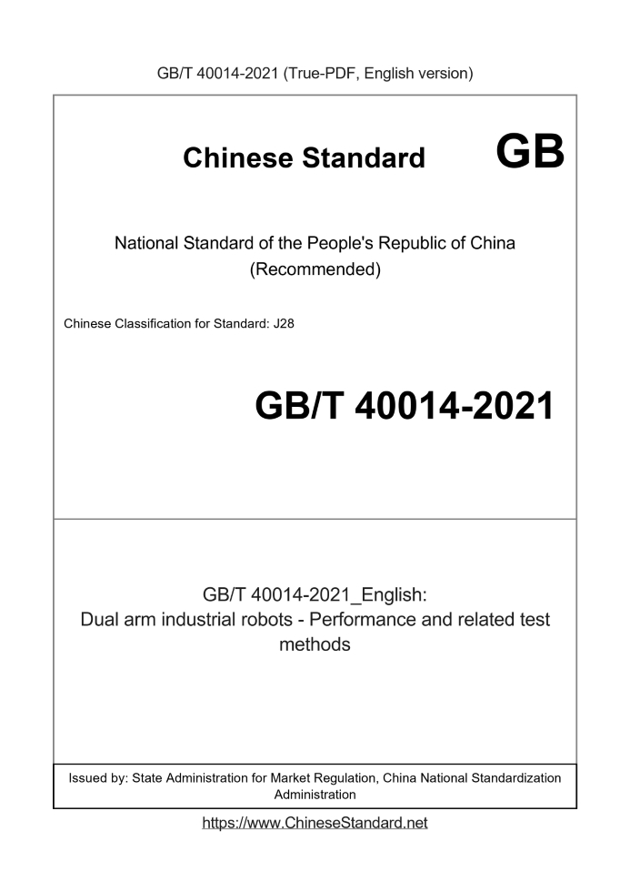 Delivery: <= 5 days. True-PDF full-copy in English will be manually translated and delivered via email. GB/T 40014-2021: Dual arm industrial robots - Performance and related test methods Status: Valid