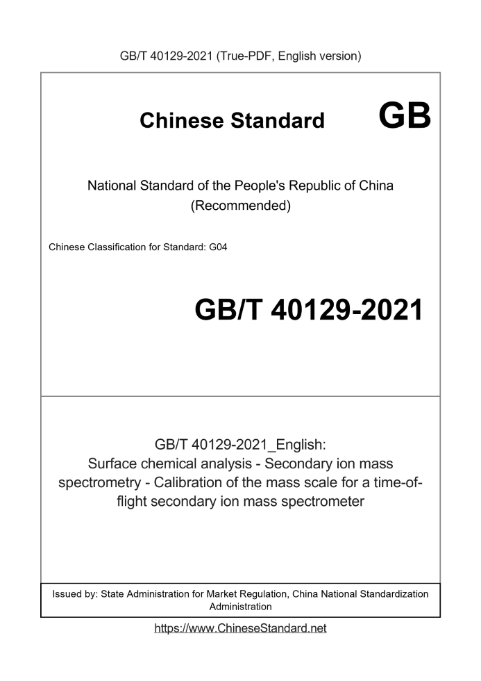 Delivery: <= 4 days. True-PDF full-copy in English will be manually translated and delivered via email. GB/T 40129-2021: Surface chemical analysis - Secondary ion mass spectrometry - Calibration of the mass scale for a time-of-flight secondary ion mass spectrometer Status: Valid