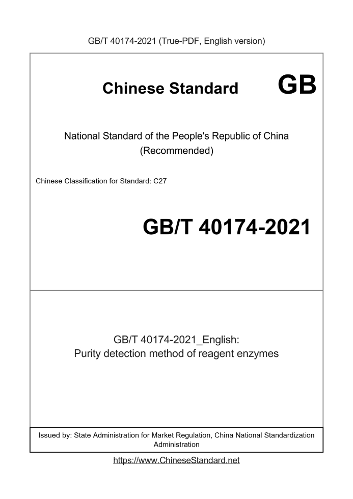 Delivery: <= 3 days. True-PDF full-copy in English will be manually translated and delivered via email. GB/T 40174-2021: Purity detection method of reagent enzymes Status: Valid