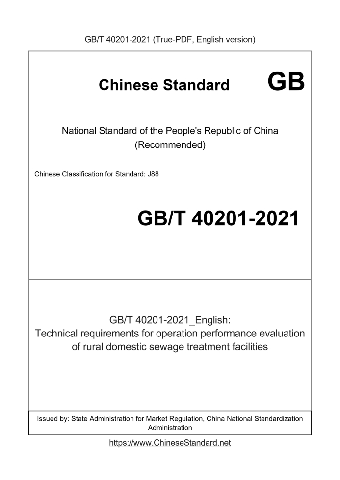 Delivery: <= 4 days. True-PDF full-copy in English will be manually translated and delivered via email. GB/T 40201-2021: Technical requirements for operation performance evaluation of rural domestic sewage treatment facilities Status: Valid
