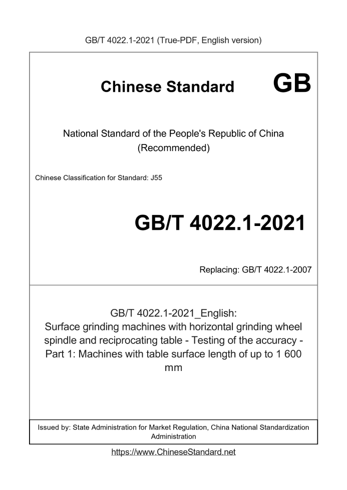 Delivery: <= 4 days. True-PDF full-copy in English will be manually translated and delivered via email. GB/T 4022.1-2021: Surface grinding machines with horizontal grinding wheel spindle and reciprocating table - Testing of the accuracy - Part 1: Machines with table surface length of up to 1 600 mm Status: Valid GB/T 4022.1: Historical versions