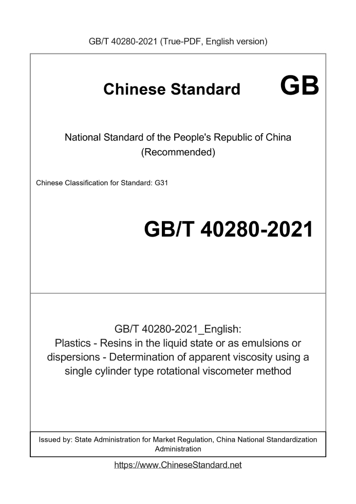 Delivery: <= 4 days. True-PDF full-copy in English will be manually translated and delivered via email. GB/T 40280-2021: Plastics - Resins in the liquid state or as emulsions or dispersions - Determination of apparent viscosity using a single cylinder type rotational viscometer method Status: Valid