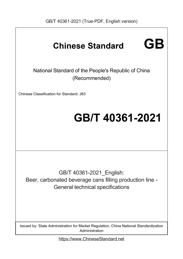 Delivery: <= 3 days. True-PDF full-copy in English will be manually translated and delivered via email. GB/T 40361-2021: Beer, carbonated beverage cans filling production line - General technical specifications Status: Valid