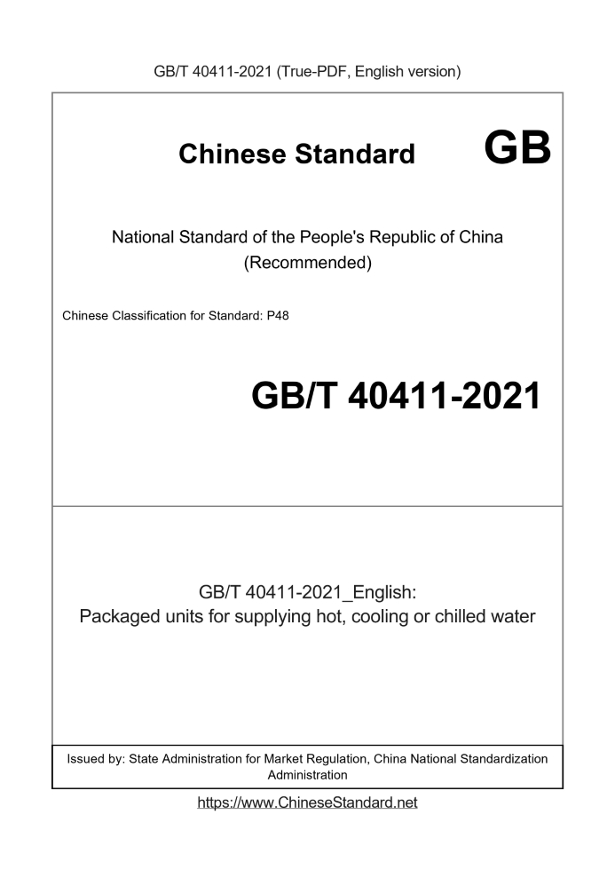 Delivery: <= 4 days. True-PDF full-copy in English will be manually translated and delivered via email. GB/T 40411-2021: Packaged units for supplying hot, cooling or chilled water Status: Valid