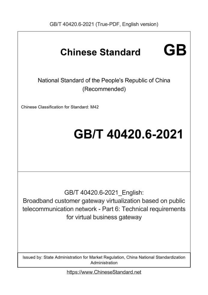 Basic dataStandard ID: GB/T 40420.6-2021 (GB/T40420.6-2021)Description (Translated English): Broadband customer gateway virtualization based on public telecommunication network - Part 6: Technical requirements for virtual business gateway Sector / Industry: National Standard (Recommended) Classification of Chinese Standard: M42 Word Count Estimation: 17,132 Issuing agency(ies): State Administration for Market Regulation, China National Standardization Administration GB/T 40420.6-2021: Broadband customer gateway virtualization based on public telecommunication network - Part 6: Technical requirements for virtual business gateway---This is a DRAFT version for illustration, not a final translation. Full copy of true-PDF in English version (including equations, symbols, images, flow-chart, tables, and figures etc.) will be manually/carefully translated upon your order. Broadband customer gateway virtualization based on public telecommunication network - Part 6.Technical requirements for virtual business gateway ICS 33.050 M42 National Standards of People's Republic of China Broadband customer gateway virtualization based on public telecommunication network Part 6.Technical requirements for virtual enterprise gateway functions Released on 2021-10-11 2022-02-01 implementation State Administration for Market Regulation Issued by the National Standardization Management Committee Table of contentsForeword Ⅰ 1 Scope 1 2 Normative references 1 3 Terms and definitions 1 4 Abbreviations 2 5 Overall architecture of enterprise gateway virtualization 3 5.1 The logical structure of enterprise gateway virtualization 3 5.2 Enterprise Virtual Gateway Function Reference Model 4 6 Virtual Enterprise Gateway Functional Requirements 5 6.1 General Requirements for Virtual Enterprise Gateway 5 6.2 Access function 6 6.3 Transmission function 6 6.4 Address function 7 6.5 QoS function 8 6.6 Safety functions 8 6.7 VPN networking function 9 6.8 Management function of the physical gateway 9 7 Management and control of virtual enterprise gateway 9 7.1 Virtual Enterprise Gateway Management Control Architecture 9 7.2 System Configuration Management 10 7.3 Alarm and diagnosis 11 7.4 Enterprise business configuration management 11 Appendix A (informative appendix) Example of business process related to enterprise virtualization gateway 12 A.1 Entity Enterprise Gateway Initial Configuration Process 12 A.2 Broadband business process 12 A.3 Business Process of Enterprise IPSecVPN Networking 12 Appendix B (informative appendix) Virtual Enterprise Gateway User Management Portal 14ForewordGB/T 40420 "Broadband Customer Gateway Virtualization Based on Public Telecommunication Networks" has released the following parts. ---Part 1.General requirements; ---Part 2.Technical requirements for voice virtualization; ---Part 3.Technical requirements for physical home gateways; ---Part 4.Entity Enterprise Gateway Technical Requirements; ---Part 5.Technical requirements for virtual home gateway functions; ---Part 6.Technical requirements for virtual enterprise gateway functions; ---Part 7.Management requirements; ---Part 8.Interface requirements. This part is Part 6 of GB/T 40420. This part was drafted in accordance with the rules given in GB/T 1.1-2009. Please note that some of the contents of this document may involve patents. The issuing agency of this document is not responsible for identifying these patents. This part was proposed by the Ministry of Industry and Information Technology of the People's Republic of China. This part is under the jurisdiction of the National Communication Standardization Technical Committee (SAC/TC485). Drafting organizations of this section. China Telecom Group Co., Ltd., China United Network Communications Group Co., Ltd., China Academy of Information and Communications Technology, China Mobile Communications Group Co., Ltd., ZTE Corporation, Huawei Technologies Co., Ltd., Fiberhome Technology Group Co., Ltd., Shanghai Nokia Bell Co., Ltd. The main drafters of this section. Hu Jie, Lu Hang, Feng Ming, Wang Bo, Xie Jiuyu, Zhi Jinlong, Li Ni, Xiao Yang, Liu Yufei, Yang Chen, Jiang Zhifeng, Shen Yigang, Li Ming, Zhu Xiaoyu, Liu Qian, Zhang Dechao, Chen Wei, Lin Wei, Han Jing, Luo Ye. Broadband customer gateway virtualization based on public telecommunication network Part 6.Technical requirements for virtual enterprise gateway functions1 ScopeThis part of GB/T 40420 specifies the logical architecture and functions of the virtual enterprise gateway after the virtualization of the broadband customer gateway of the public telecommunication network Reference model, software function, protocol, etc. requirements. This section applies to virtual enterprise gateways based on public telecommunication networks. Note. Unless otherwise specified, broadband customer networks appearing in this section all refer to broadband customer networks based on public telecommunications networks, and telecommunications networks all refer to public telecommunications Network and virtual gateway refer to virtual enterprise gateway.2 Normative referencesThe following documents are indispensable for the application of this document. For dated reference documents, only the dated version applies to this article Pieces. For undated reference documents, the latest version (including all amendments) is applicable to this document. GB/T 40420.1-2021 Broadband customer gateway virtualization based on public telecommunication network Part 1.General requirements YD/T 2372-2011 General technical requirements for access network supporting IPv6 IETFRFC2661 Layer Two Tunneling Protocol (LayerTwoTunnelingProtocol "L2TP") IETFRFC2663 IP network address translator (NAT) terms and precautions [IPNetworkAddressTranslator (NAT)TerminologyandConsiderations] IETFRFC3022 Traditional IP network address translation [TraditionalIPNetworkAddressTranslator(Traditional NAT)] IETFRFC3027 uses the protocol complexity of IP network address translation (ProtocolCompl