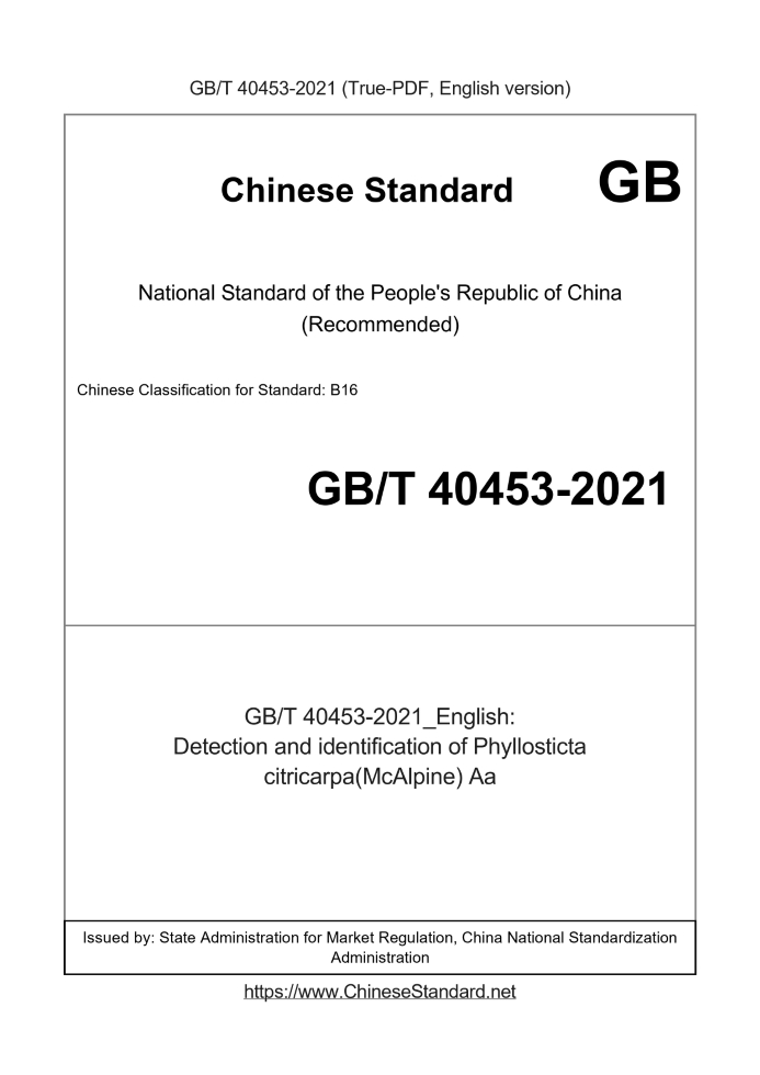 Delivery: <= 4 days. True-PDF full-copy in English will be manually translated and delivered via email. GB/T 40453-2021: Detection and identification of Phyllosticta citricarpa(McAlpine) Aa Status: Valid