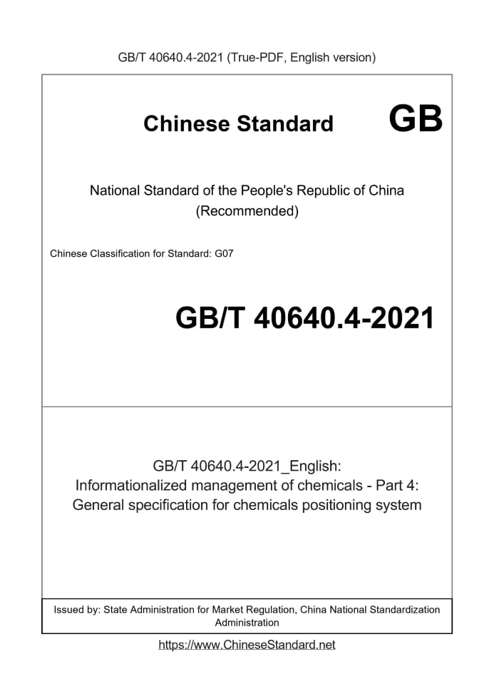 Delivery: <= 3 days. True-PDF full-copy in English will be manually translated and delivered via email. GB/T 40640.4-2021: Informationalized management of chemicals - Part 4: General specification for chemicals positioning system Status: Valid