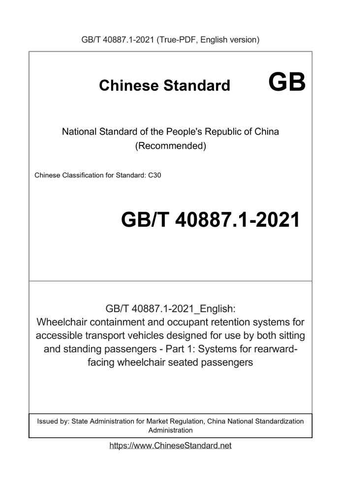 Delivery: <= 3 days. True-PDF full-copy in English will be manually translated and delivered via email. GB/T 40887.1-2021: Wheelchair containment and occupant retention systems for accessible transport vehicles designed for use by both sitting and standing passengers - Part 1: Systems for rearward-facing wheelchair seated passengers Status: Valid