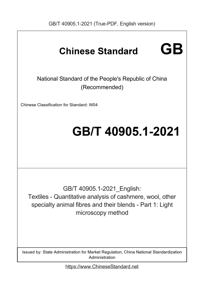 Delivery: <= 7 days. True-PDF full-copy in English will be manually translated and delivered via email. GB/T 40905.1-2021: Textiles - Quantitative analysis of cashmere, wool, other specialty animal fibres and their blends - Part 1: Light microscopy method Status: Valid