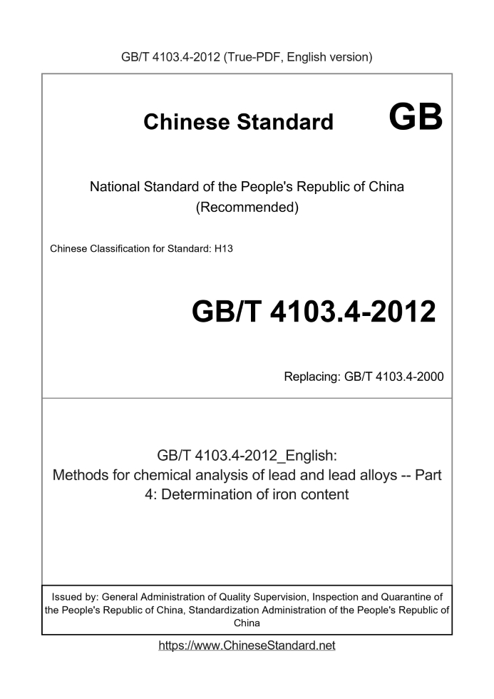 Delivery: <= 3 days. True-PDF full-copy in English will be manually translated and delivered via email. GB/T 4103.4-2012: Methods for chemical analysis of lead and lead alloys -- Part 4: Determination of iron content Status: Valid GB/T 4103.4: Historical versions