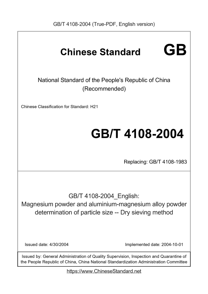Delivery: <= 2 days. True-PDF full-copy in English will be manually translated and delivered via email. GB/T 4108-2004: Magnesium powder and aluminium-magnesium alloy powder determination of particle size -- Dry sieving method Status: Obsolete GB/T 4108: Historical versions