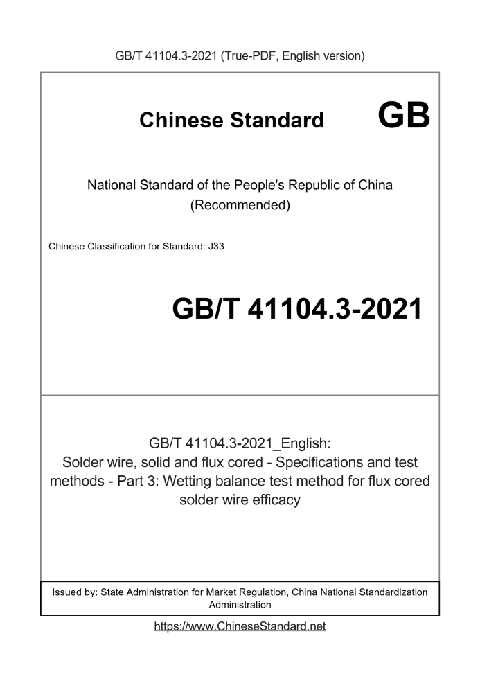 GB/T 41104.3-2021: Solder wire, solid and flux cored - Specifications and test methods - Part 3: Wetting balance test method for flux cored solder wire efficacy