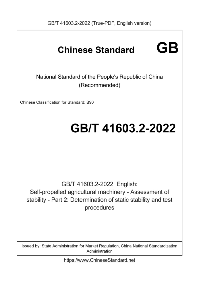 Delivery: <= 4 days. True-PDF full-copy in English will be manually translated and delivered via email. GB/T 41603.2-2022: Self-propelled agricultural machinery - Assessment of stability - Part 2: Determination of static stability and test procedures Status: Valid
