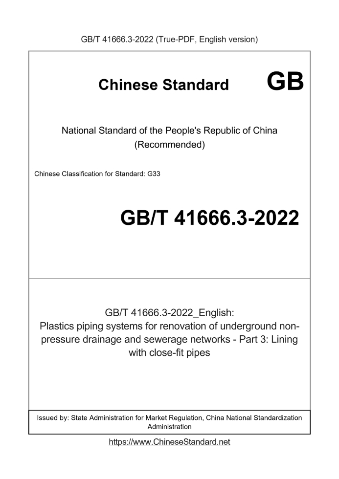 Delivery: <= 5 days. True-PDF full-copy in English will be manually translated and delivered via email. GB/T 41666.3-2022: Plastics piping systems for renovation of underground non-pressure drainage and sewerage networks - Part 3: Lining with close-fit pipes Status: Valid
