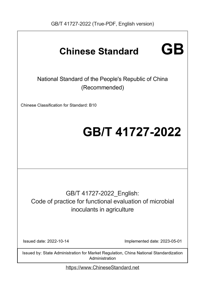 Delivery: <= 4 days. True-PDF full-copy in English will be manually translated and delivered via email. GB/T 41727-2022: Code of practice for functional evaluation of microbial inoculants in agriculture Status: Valid