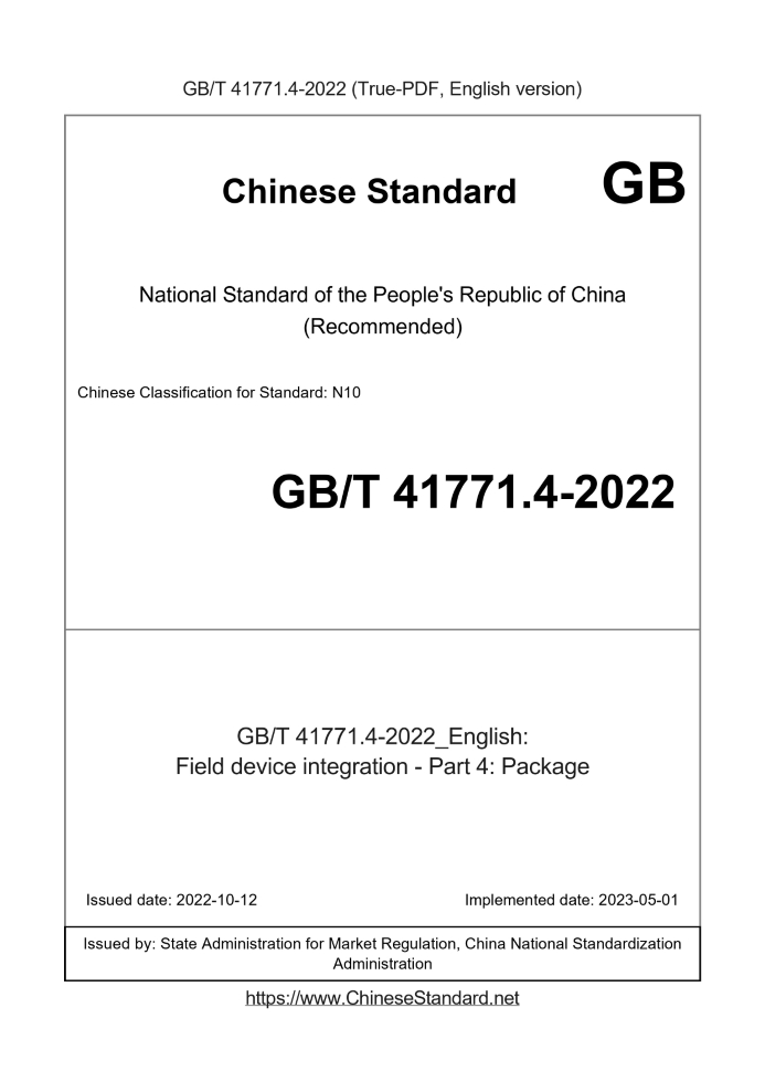Delivery: <= 9 days. True-PDF full-copy in English will be manually translated and delivered via email. GB/T 41771.4-2022: Field device integration - Part 4: Package Status: Valid