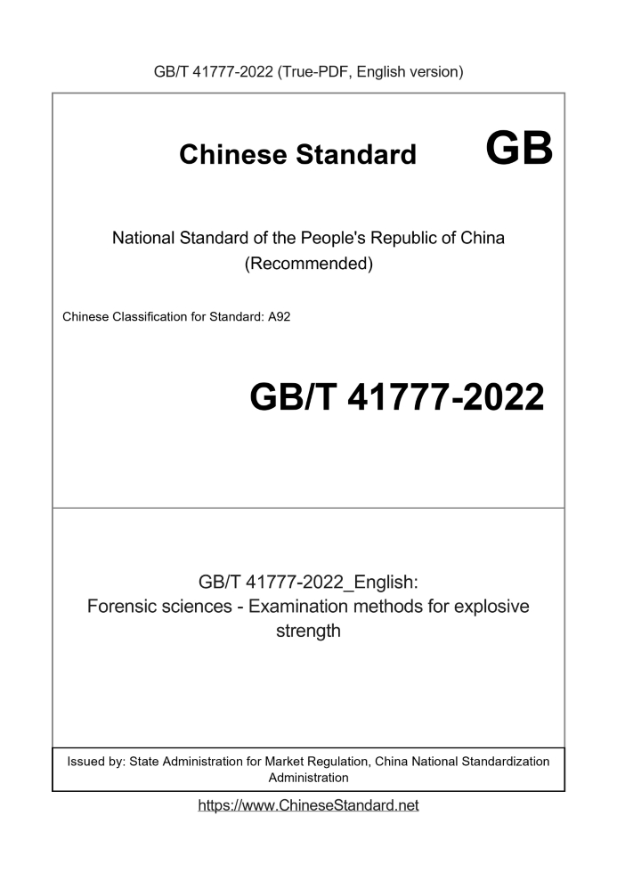 Delivery: <= 3 days. True-PDF full-copy in English will be manually translated and delivered via email. GB/T 41777-2022: Forensic sciences - Examination methods for explosive strength Status: Valid