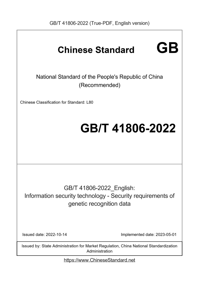 Delivery: <= 5 days. True-PDF full-copy in English will be manually translated and delivered via email. GB/T 41806-2022: Information security technology - Security requirements of genetic recognition data Status: Valid