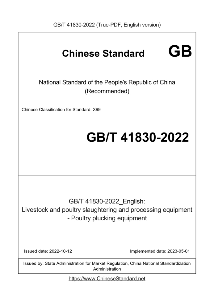 Delivery: <= 3 days. True-PDF full-copy in English will be manually translated and delivered via email. GB/T 41830-2022: Livestock and poultry slaughtering and processing equipment - Poultry plucking equipment Status: Valid