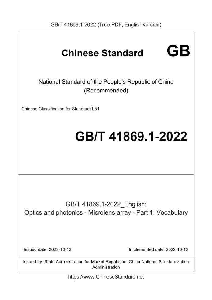 Delivery: <= 5 days. True-PDF full-copy in English will be manually translated and delivered via email. GB/T 41869.1-2022: Optics and photonics - Microlens array - Part 1: Vocabulary Status: Valid