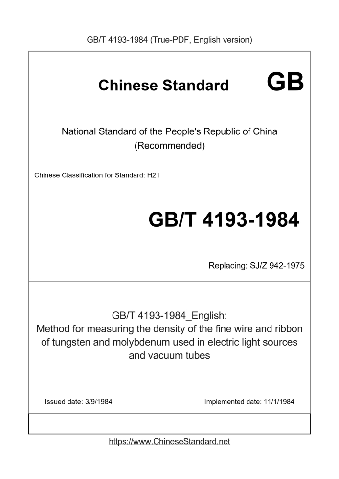 Delivery: <= 2 days. True-PDF full-copy in English will be manually translated and delivered via email. GB/T 4193-1984: Method for measuring the density of the fine wire and ribbon of tungsten and molybdenum used in electric light sources and vacuum tubes