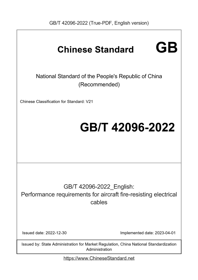 Delivery: <= 4 days. True-PDF full-copy in English will be manually translated and delivered via email. GB/T 42096-2022: Performance requirements for aircraft fire-resisting electrical cables Status: Valid