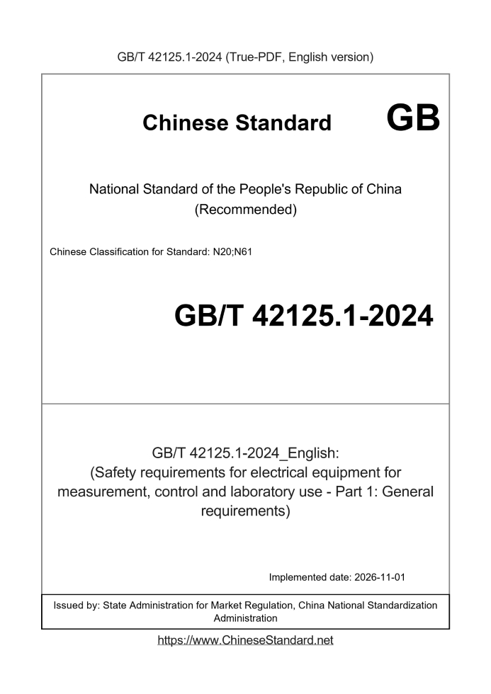Delivery: <= 10 days. True-PDF full-copy in English will be manually translated and delivered via email. GB/T 42125.1-2024: (Safety requirements for electrical equipment for measurement, control and laboratory use - Part 1: General requirements) Status: Valid