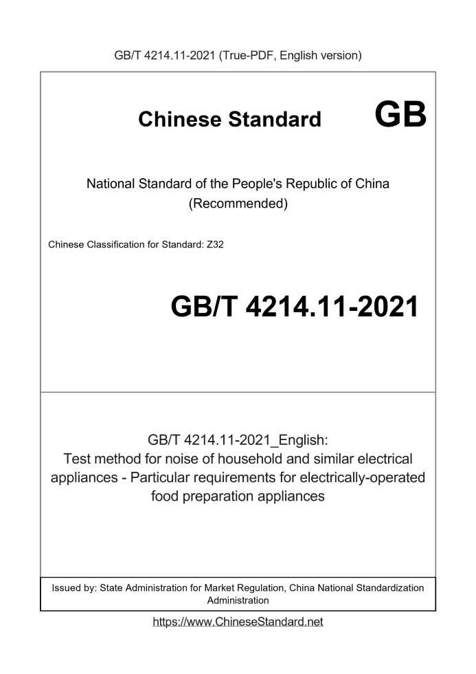 Delivery: <= 3 days. True-PDF full-copy in English will be manually translated and delivered via email. GB/T 4214.11-2021: Test method for noise of household and similar electrical appliances - Particular requirements for electrically-operated food preparation appliances Status: Valid