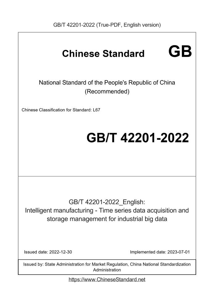 Delivery: <= 3 days. True-PDF full-copy in English will be manually translated and delivered via email. GB/T 42201-2022: Intelligent manufacturing - Time series data acquisition and storage management for industrial big data Status: Valid