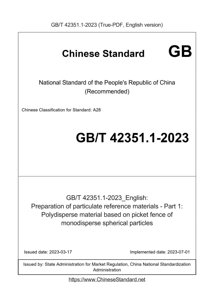 Delivery: <= 5 days. True-PDF full-copy in English will be manually translated and delivered via email. GB/T 42351.1-2023: Preparation of particulate reference materials - Part 1: Polydisperse material based on picket fence of monodisperse spherical particles Status: Valid