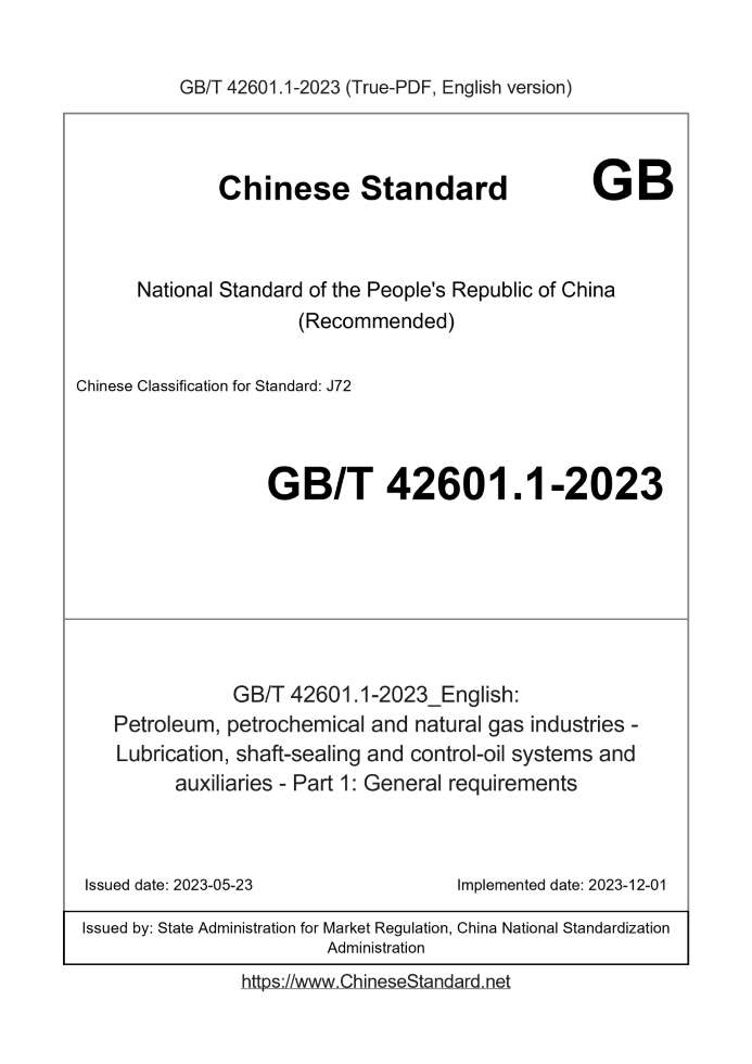 Delivery: <= 7 days. True-PDF full-copy in English will be manually translated and delivered via email. GB/T 42601.1-2023: Petroleum, petrochemical and natural gas industries - Lubrication, shaft-sealing and control-oil systems and auxiliaries - Part 1: General requirements Status: Valid