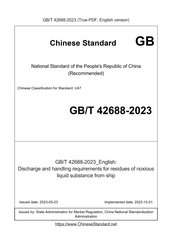 Delivery: <= 3 days. True-PDF full-copy in English will be manually translated and delivered via email. GB/T 42688-2023: Discharge and handling requirements for residues of noxious liquid substance from ship Status: Valid