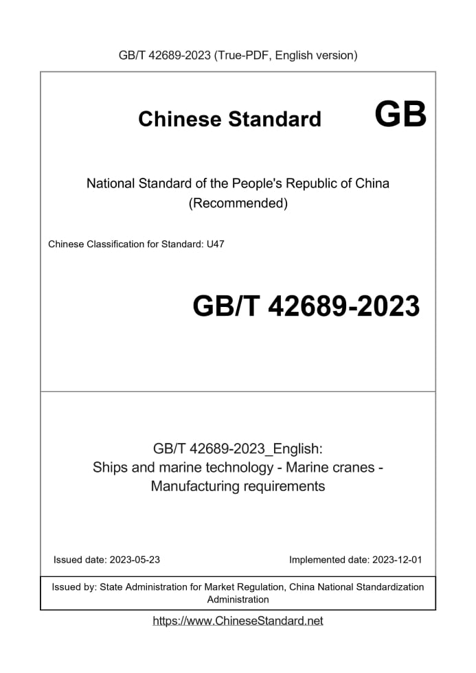 Delivery: <= 3 days. True-PDF full-copy in English will be manually translated and delivered via email. GB/T 42689-2023: Ships and marine technology - Marine cranes - Manufacturing requirements Status: Valid