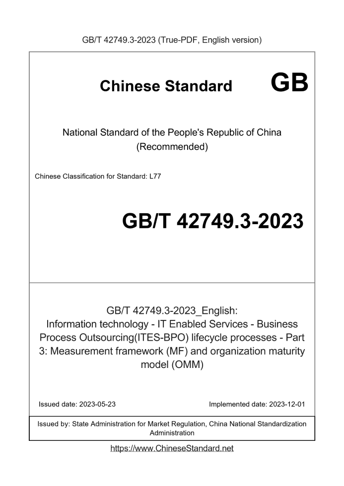 Delivery: <= 5 days. True-PDF full-copy in English will be manually translated and delivered via email. GB/T 42749.3-2023: Information technology - IT Enabled Services - Business Process Outsourcing(ITES-BPO) lifecycle processes - Part 3: Measurement framework (MF) and organization maturity model (OMM) Status: Valid