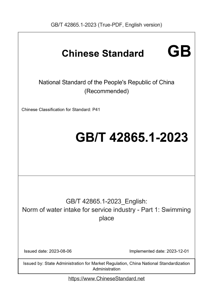 This document complies with the provisions of GB/T 1.1-2020 "Standardization Work Guidelines Part 1.Structure and Drafting Rules of Standardization Documents" Drafting. This document is Part 1 of GB/T 42865 "Water Quotas for Service Industry". GB/T 42865 has released the following parts. ---Part 1.Swimming places. Please note that some content in this document may be subject to patents. The publisher of this document assumes no responsibility for identifying patents. This document is proposed by the Ministry of Water Resources of the People's Republic of China. This document is under the jurisdiction of the National Water Conservation Standardization Technical Committee (SAC/TC442). This document was drafted by. China Institute of Standardization, Water Conservation Promotion Center of the Ministry of Water Resources, Bashan Group Co., Ltd., and the State Sports General Administration Sports Science Institute, China Water Conservancy and Hydropower Research Institute, Beijing Municipal Water Affairs Bureau, Songliao Water Conservancy Committee of the Ministry of Water Resources, and Beijing Municipal Water Supply Management Committee Service Center, Hubei Provincial Institute of Standardization and Quality, Xinjiang Corps Survey and Design Institute (Group) Co., Ltd., China Construction Third Engineering Bureau Green Industry Investment Capital Co., Ltd., Dongguan Zhongbiao Technology Co., Ltd., Zhejiang Zhengkang Industrial Co., Ltd., Suzhou Water Conservancy and Hydropower Building Survey and Design Co., Ltd. Co., Ltd., Ningbo Tianhe Water Ecological Technology Co., Ltd., Shandong Water Conservancy Survey and Design Institute Co., Ltd., Zhejiang Jinhua Shuntai Hydropower Construction Ltd. The main drafters of this document. Bai Xue, Cai Rong, Yang Guohua, Liu Jialin, Lu Yan, Bai Yan, Zhang Lan, Liu Jinmei, Xiao Jun, Lu Yingzhi, Zhang Xinxin, Wang Qian, Huang Xifa, Zhang Xueqian, Zhang Dawei, Zhang Yanling, He Guohua, Wang Yong, Huang Rong, Chen Yanming, Mu Li, Tang Dingding, Lu Zhongxing, Zheng Fengqiong, Wang Haidong, Chen Deyang, Wang Dong, Tan Leyan, Wu Jingfeng, Zhang Changlong, Ma Hongxing, Zhang Shuiping.
