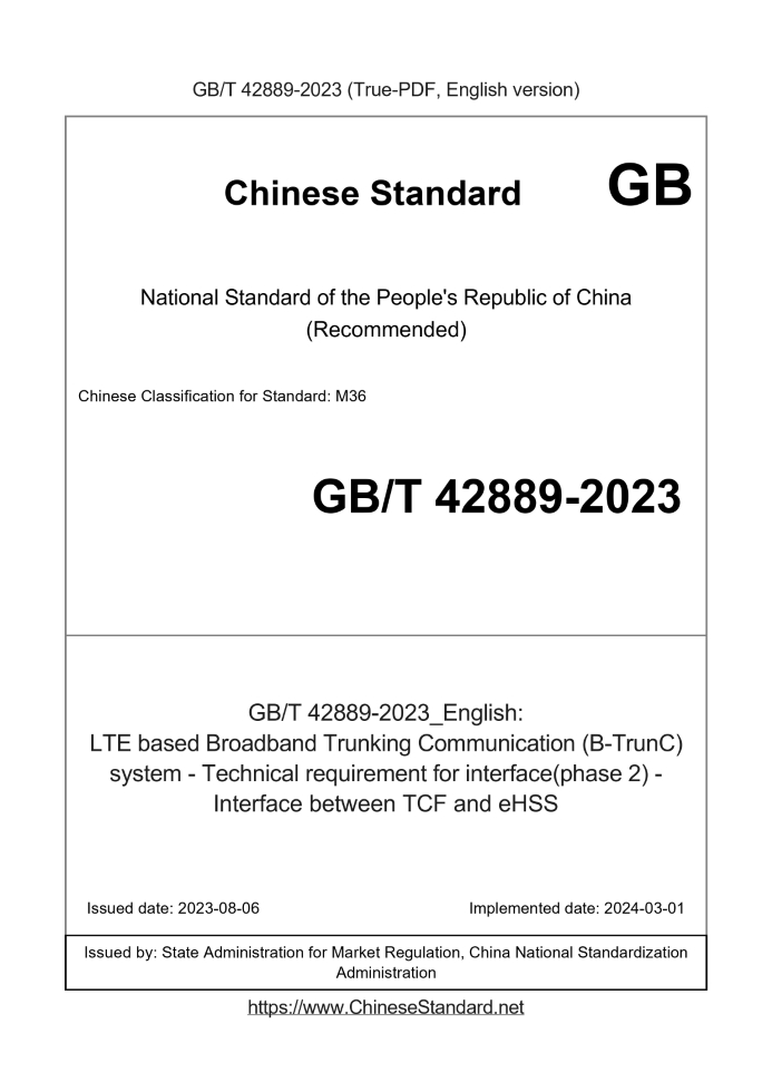Delivery: <= 8 days. True-PDF full-copy in English will be manually translated and delivered via email. GB/T 42889-2023: LTE based Broadband Trunking Communication (B-TrunC) system - Technical requirement for interface(phase 2) - Interface between TCF and eHSS Status: Valid