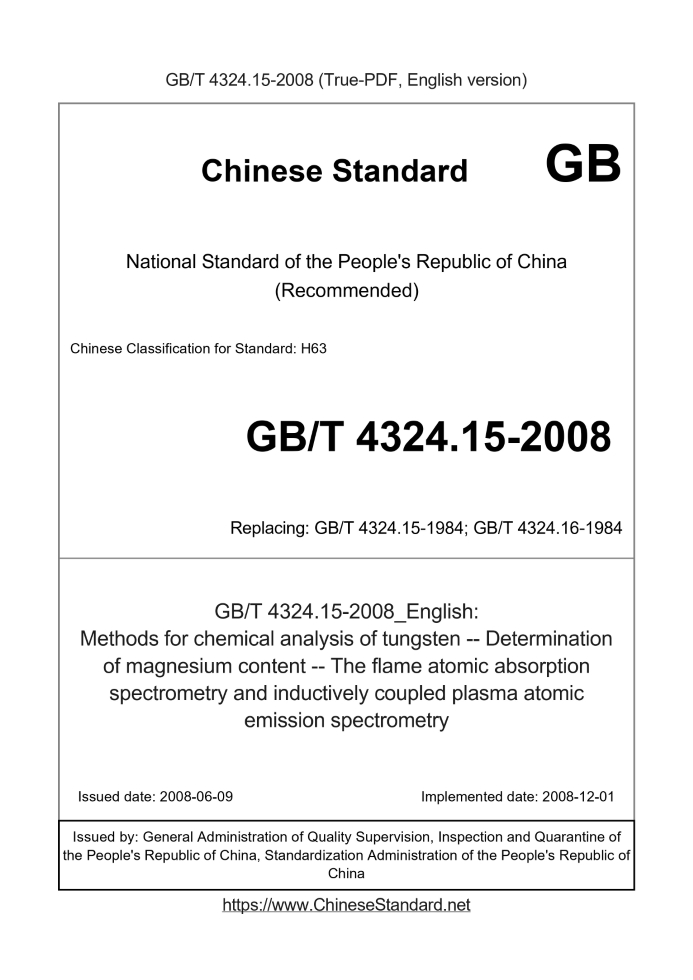 Delivery: <= 3 days. True-PDF full-copy in English will be manually translated and delivered via email. GB/T 4324.15-2008: Methods for chemical analysis of tungsten -- Determination of magnesium content -- The flame atomic absorption spectrometry and inductively coupled plasma atomic emission spectrometry Status: Valid GB/T 4324.15: Historical versions