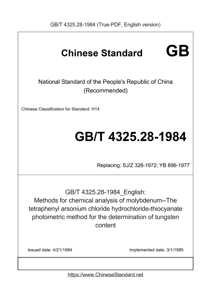 Delivery: <= 2 days. True-PDF full-copy in English will be manually translated and delivered via email. GB/T 4325.28-1984: Methods for chemical analysis of molybdenum--The tetraphenyl arsonium chloride hydrochloride-thiocyanate photometric method for the determination of tungsten content Status: Obsolete