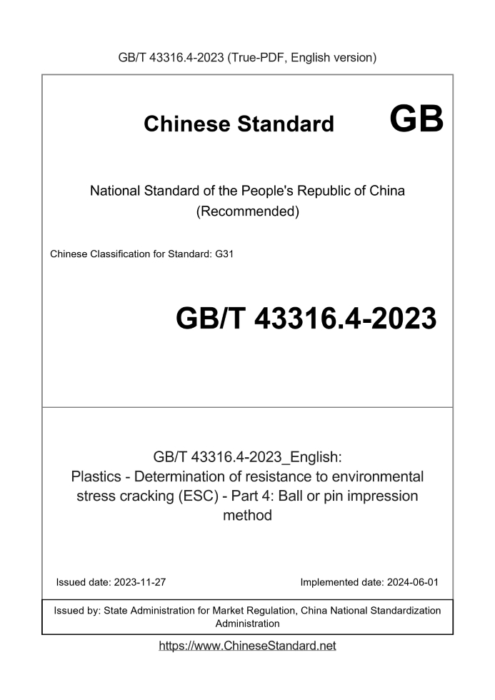 Delivery: <= 4 days. True-PDF full-copy in English will be manually translated and delivered via email. GB/T 43316.4-2023: Plastics - Determination of resistance to environmental stress cracking (ESC) - Part 4: Ball or pin impression method Status: Valid