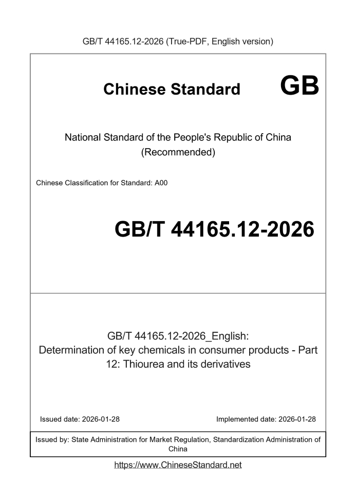 US$299.00 · In stock · Download in 9 secondsGB/T 44165.12-2026: Determination of key chemicals in consumer products - Part 12: Thiourea and its derivatives