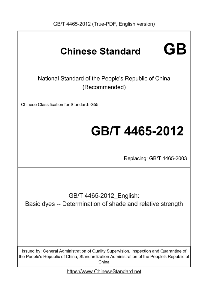 Basic dyes. Determination of shade and relative strength ICS 71.100.01; 87.060.10 G55 National Standards of People's Republic of China Replacing GB/T 4465-2003 Determination of basic dye shade and intensity Issued on. 2012-06-29 2012-12-01 implementation Administration of Quality Supervision, Inspection and Quarantine of People's Republic of China Standardization Administration of China released