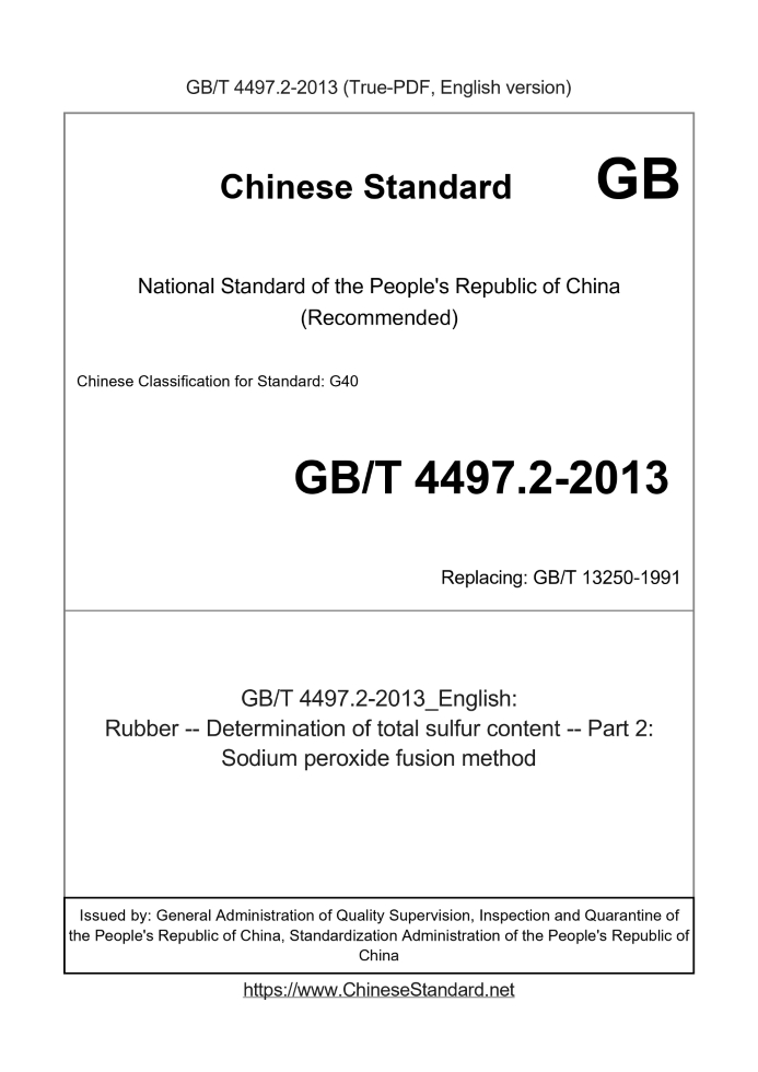 Delivery: <= 3 days. True-PDF full-copy in English will be manually translated and delivered via email. GB/T 4497.2-2013: Rubber -- Determination of total sulfur content -- Part 2: Sodium peroxide fusion method Status: Valid