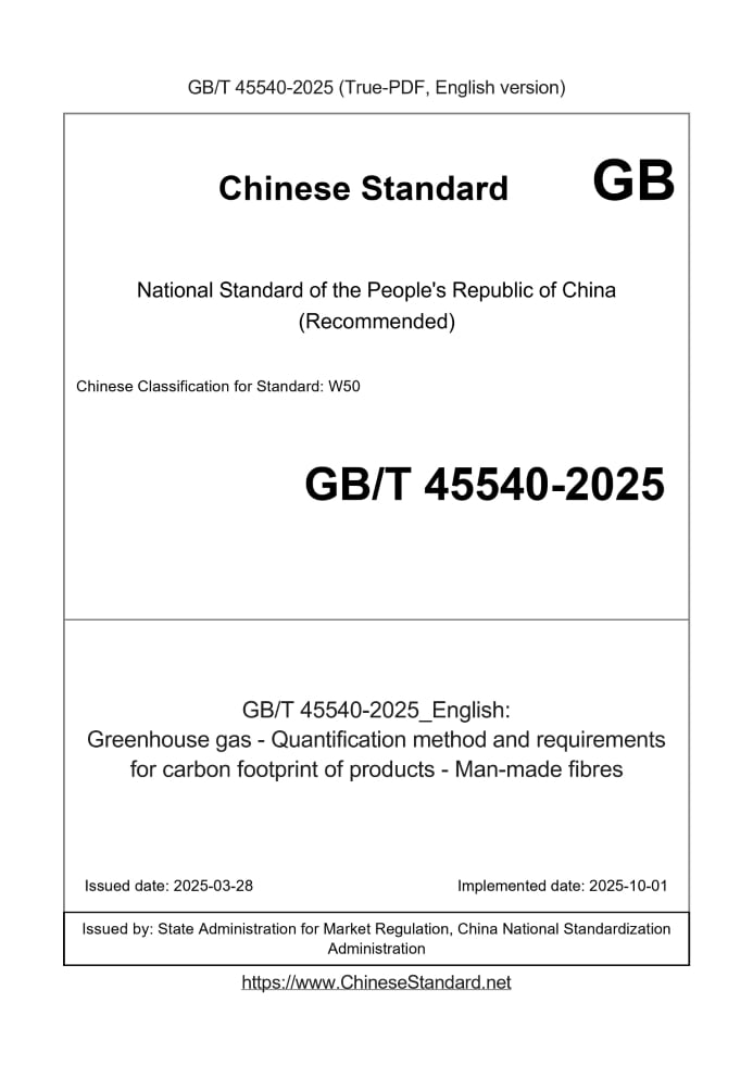 Delivery: <= 5 days. True-PDF full-copy in English will be manually translated and delivered via email. GB/T 45540-2025: Greenhouse gas - Quantification method and requirements for carbon footprint of products - Man-made fibres Status: Valid