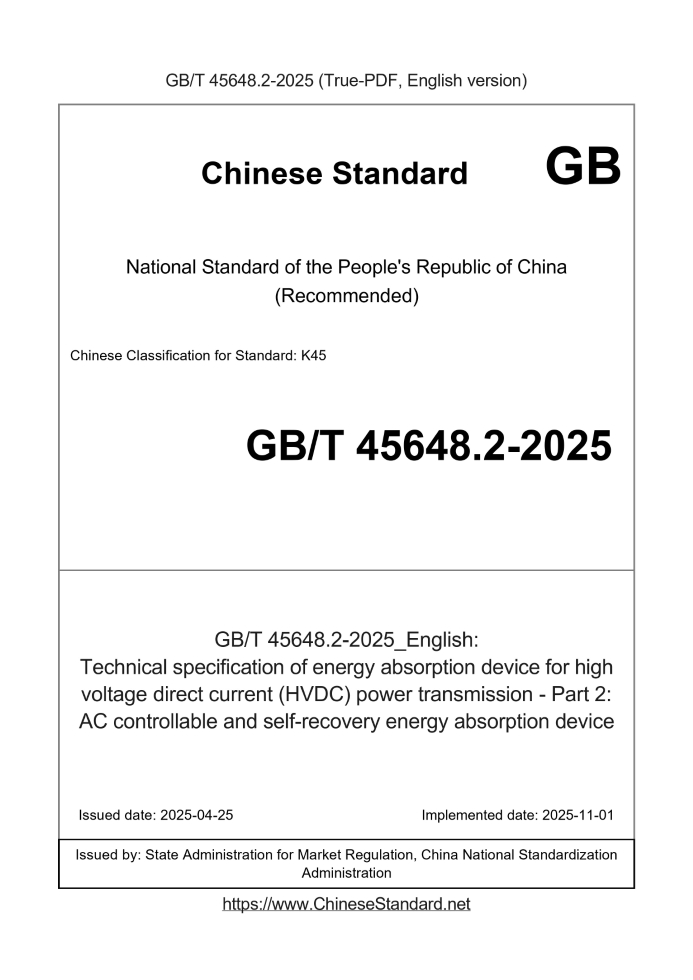 Delivery: <= 5 days. True-PDF full-copy in English will be manually translated and delivered via email. GB/T 45648.2-2025: Technical specification of energy absorption device for high voltage direct current (HVDC) power transmission - Part 2: AC controllable and self-recovery energy absorption device Status: Valid