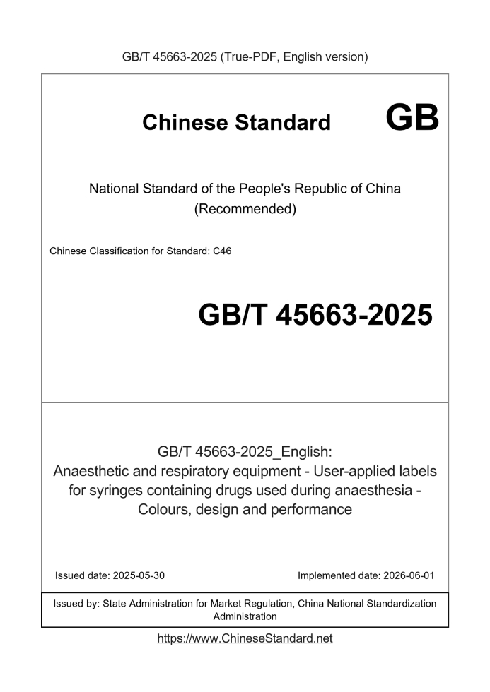 Delivery: <= 3 days. True-PDF full-copy in English will be manually translated and delivered via email. GB/T 45663-2025: Anaesthetic and respiratory equipment - User-applied labels for syringes containing drugs used during anaesthesia - Colours, design and performance Status: Valid