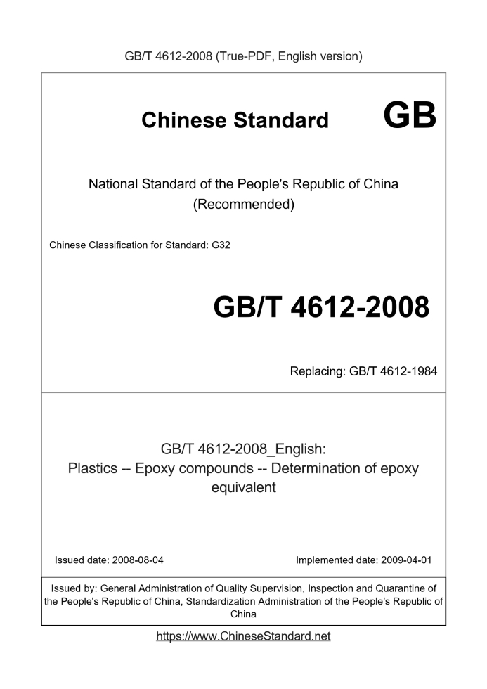 Delivery: <= 3 days. True-PDF full-copy in English will be manually translated and delivered via email. GB/T 4612-2008: Plastics -- Epoxy compounds -- Determination of epoxy equivalent Status: Valid GB/T 4612: Historical versions